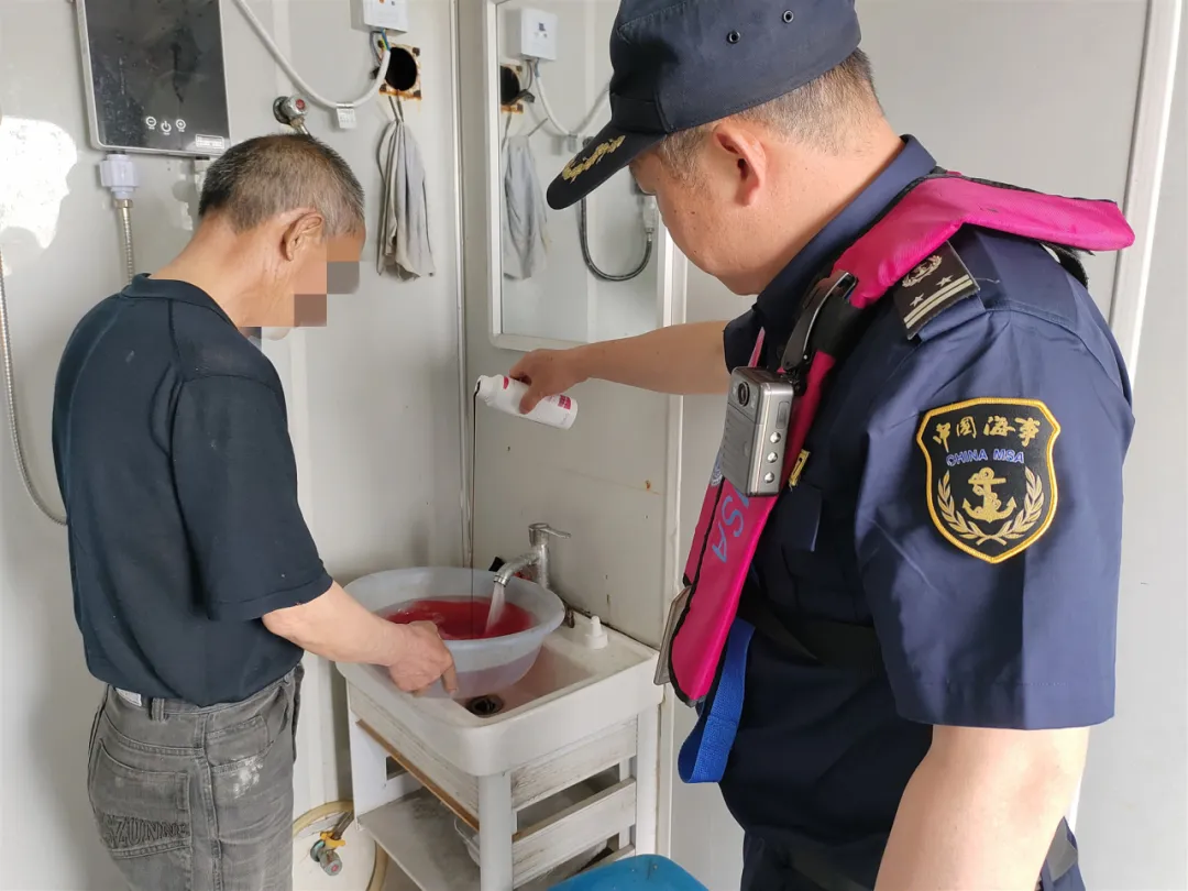 不过该船轮机长闪烁其词,坚称本船生活污水均流至储存柜,不承认违规排放。执法人员随即使用示踪剂进行冲水试验,不久后,船尾的水面出现了红色液体。