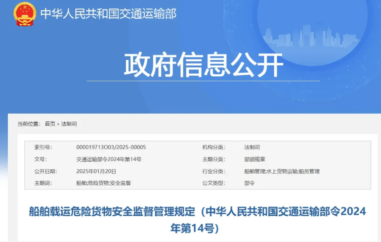 2024年12月31日,交通运输部公布了新修订的《船舶载运危险货物安全监督管理规定》(交通运输部令2024年第14号),将于2025年3月1日起施行。新规定由原来的八章共52条,修改为七章共51条,分别为总则、船舶和人员管理、包装和集装箱管理、申报和报告管理、作业安全管理、法律责任、附则。为了有效执行该规定,来跟小编看一看有哪些变化吧!