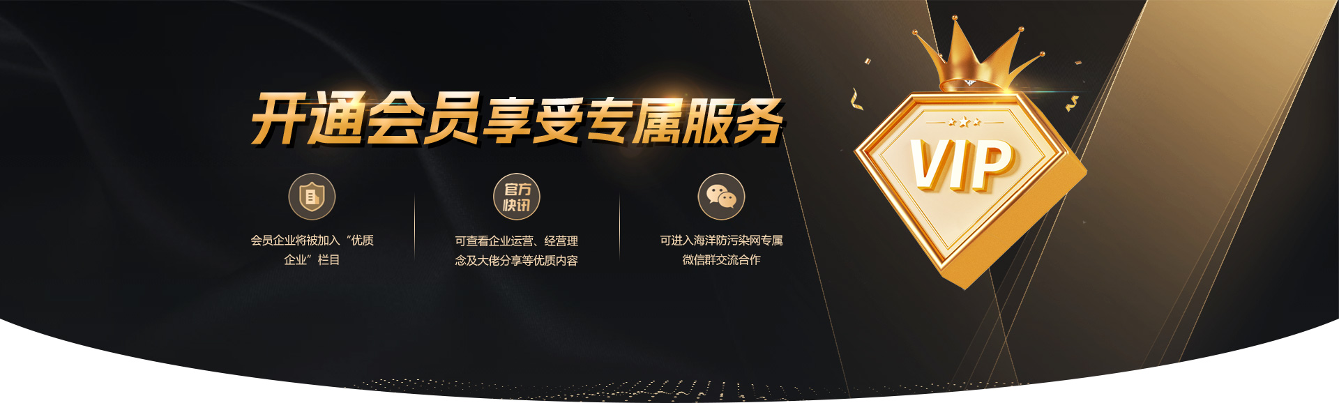 | 高级VIP会员 | 名企展示,新闻资讯,会议通知,全年三人免费参会3次,高级业务对接,优质商业机会,可享受海洋防污染网首 页广告位xx区全年的宣传服务,会议赞助单位冠名一次。可在“海洋防污染网”资讯中心、微信公众号中为企业写专属文 章,进一步做大、做好企业宣传服务。 | ¥98888/年 |